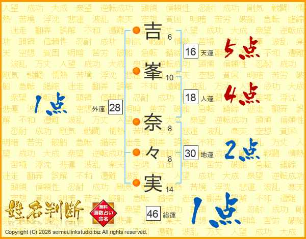 吉(6画)峯(10画) 奈(8画)々(8画)実(14画)