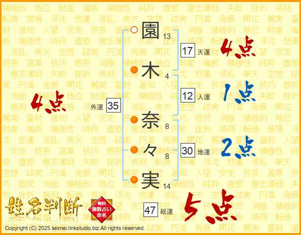 園(13画)木(4画) 奈(8画)々(8画)実(14画)