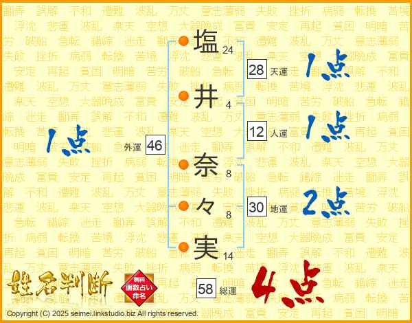 塩(24画)井(4画) 奈(8画)々(8画)実(14画)