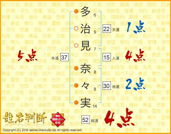 多(6画)治(9画)見(7画) 奈(8画)々(8画)実(14画)