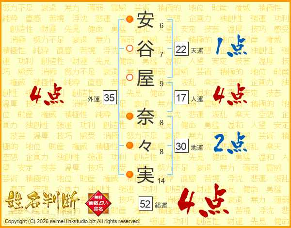 安(6画)谷(7画)屋(9画) 奈(8画)々(8画)実(14画)