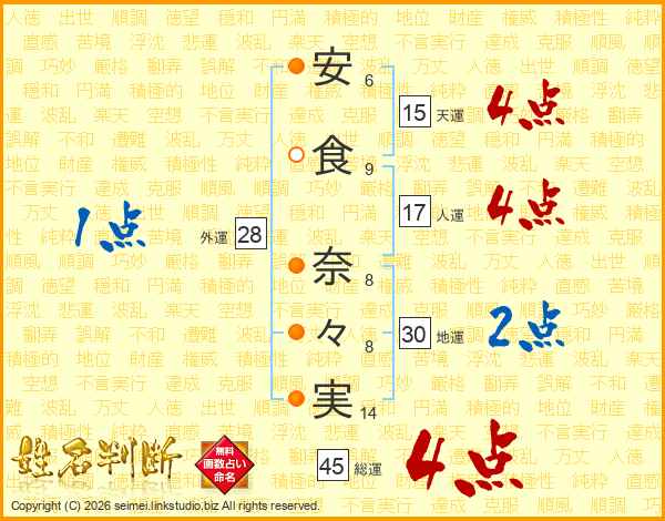 安(6画)食(9画) 奈(8画)々(8画)実(14画)