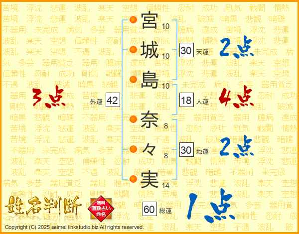 宮(10画)城(10画)島(10画) 奈(8画)々(8画)実(14画)