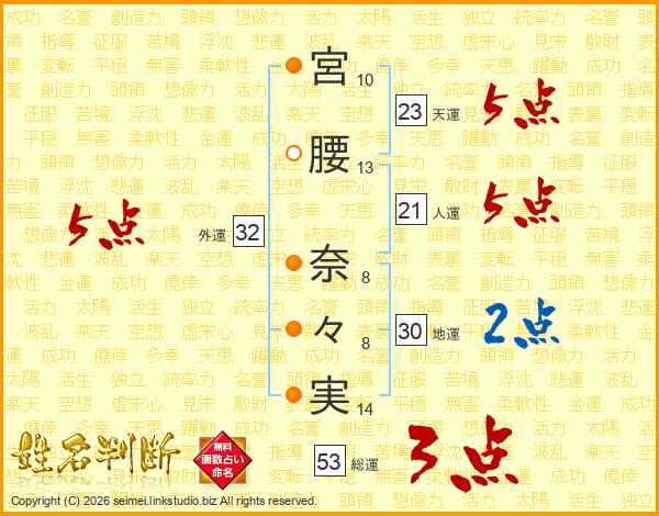 宮(10画)腰(13画) 奈(8画)々(8画)実(14画)
