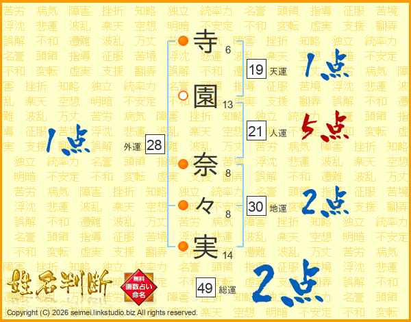 寺(6画)園(13画) 奈(8画)々(8画)実(14画)