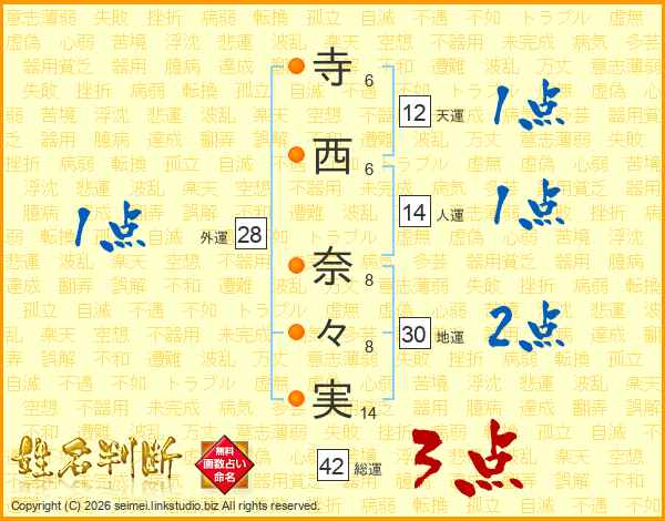 寺(6画)西(6画) 奈(8画)々(8画)実(14画)