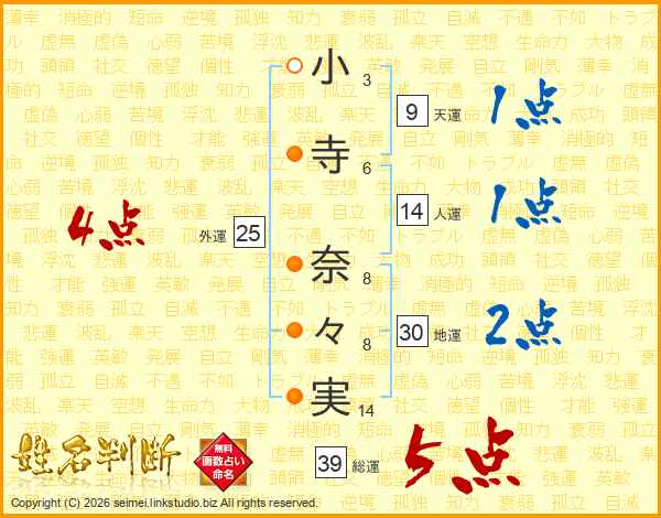 小(3画)寺(6画) 奈(8画)々(8画)実(14画)