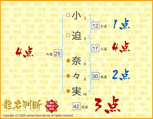 小(3画)迫(9画) 奈(8画)々(8画)実(14画)
