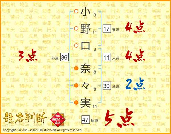 小(3画)野(11画)口(3画) 奈(8画)々(8画)実(14画)