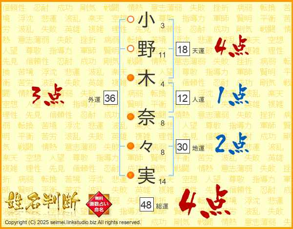 小(3画)野(11画)木(4画) 奈(8画)々(8画)実(14画)