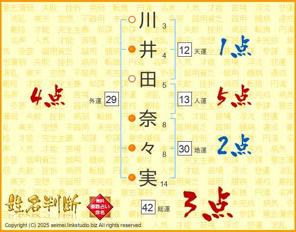 川(3画)井(4画)田(5画) 奈(8画)々(8画)実(14画)