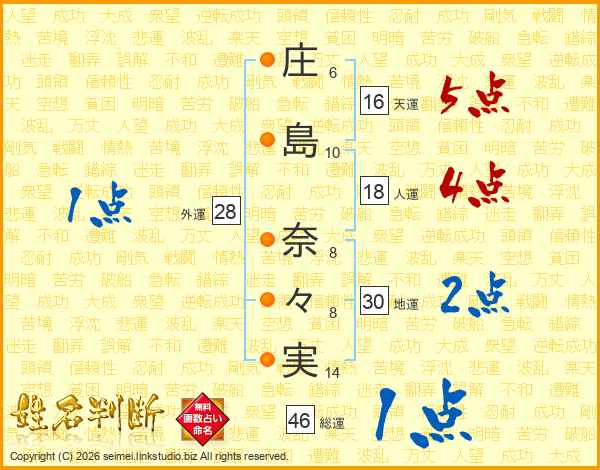 庄(6画)島(10画) 奈(8画)々(8画)実(14画)