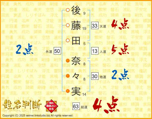 後(9画)藤(19画)田(5画) 奈(8画)々(8画)実(14画)