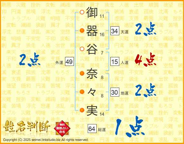 御(11画)器(16画)谷(7画)  奈(8画)々(8画)実(14画)