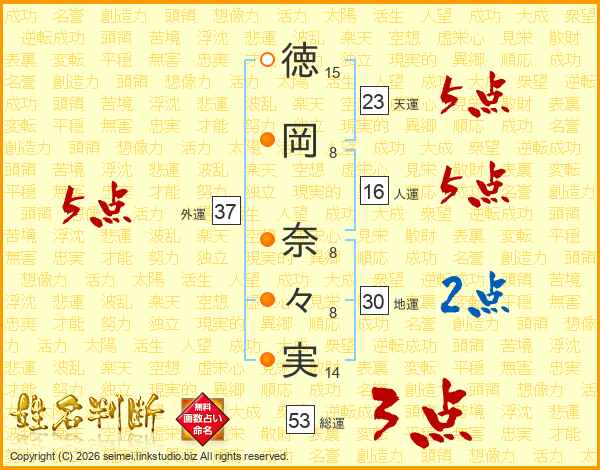 徳(15画)岡(8画) 奈(8画)々(8画)実(14画)