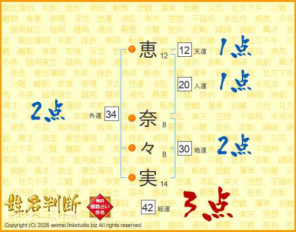 恵(12画) 奈(8画)々(8画)実(14画)