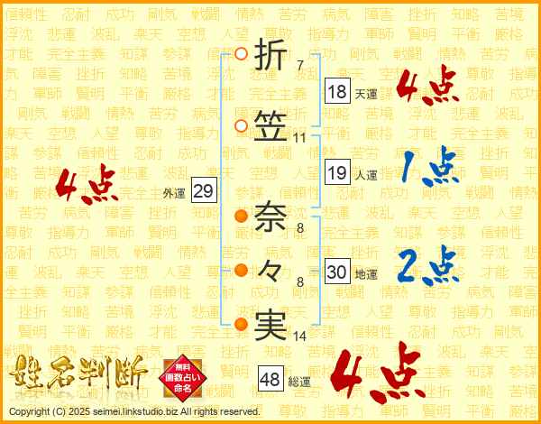 折(7画)笠(11画) 奈(8画)々(8画)実(14画)