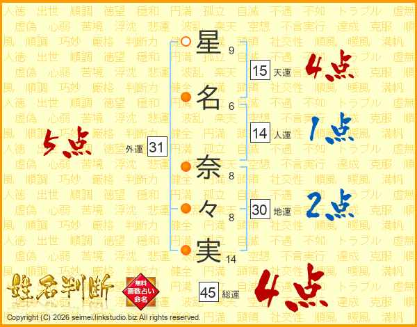 星(9画)名(6画) 奈(8画)々(8画)実(14画)