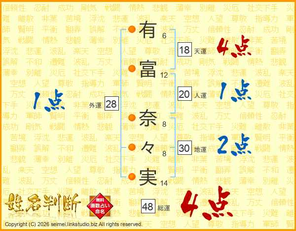 有(6画)富(12画) 奈(8画)々(8画)実(14画)