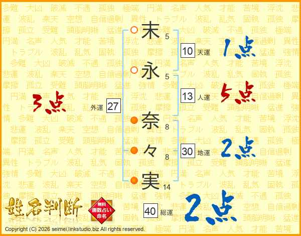 末(5画)永(5画) 奈(8画)々(8画)実(14画)