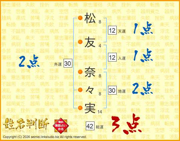 松(8画)友(4画) 奈(8画)々(8画)実(14画)