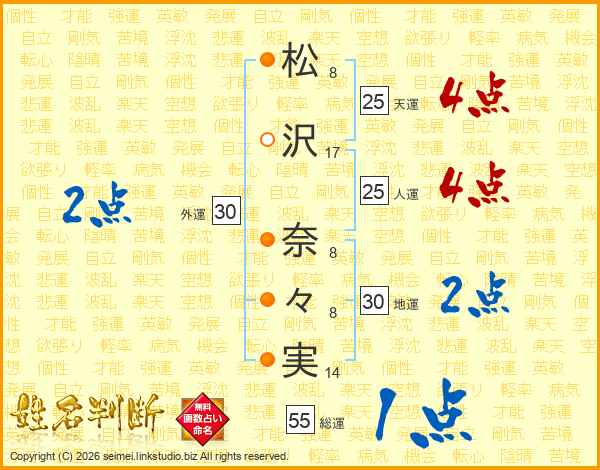 松(8画)沢(17画) 奈(8画)々(8画)実(14画)