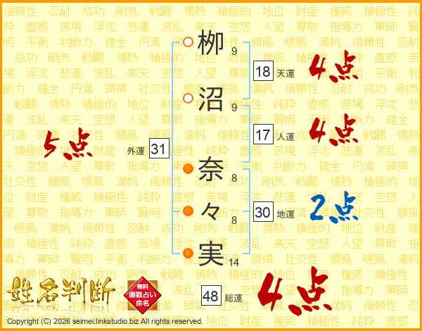 栁(9画)沼(9画) 奈(8画)々(8画)実(14画)
