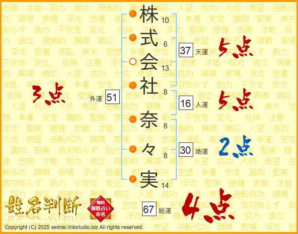 株(10画)式(6画)会(13画)社(8画) 奈(8画)々(8画)実(14画)