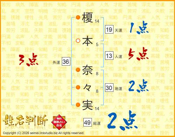榎(14画)本(5画) 奈(8画)々(8画)実(14画)
