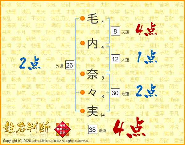 毛(4画)内(4画) 奈(8画)々(8画)実(14画)