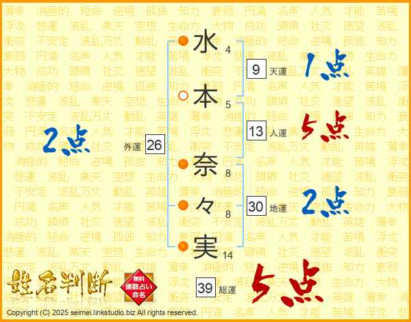 水(4画)本(5画) 奈(8画)々(8画)実(14画)