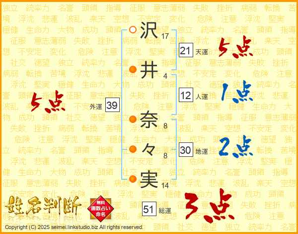 沢(17画)井(4画) 奈(8画)々(8画)実(14画)