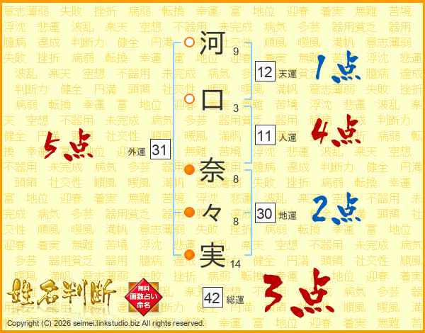 河(9画)口(3画) 奈(8画)々(8画)実(14画)