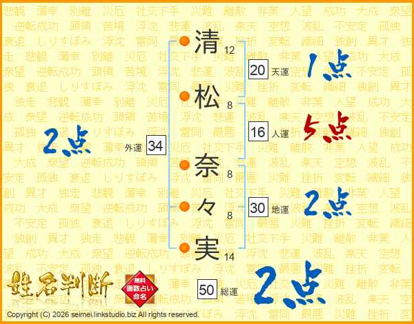清(12画)松(8画) 奈(8画)々(8画)実(14画)