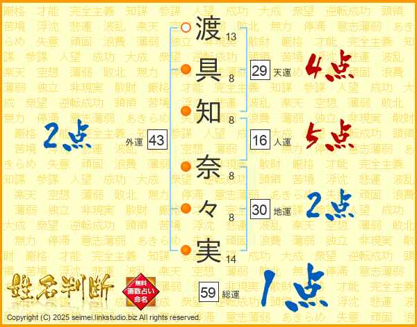 渡(13画)具(8画)知(8画) 奈(8画)々(8画)実(14画)