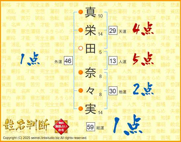 真(10画)栄(14画)田(5画) 奈(8画)々(8画)実(14画)