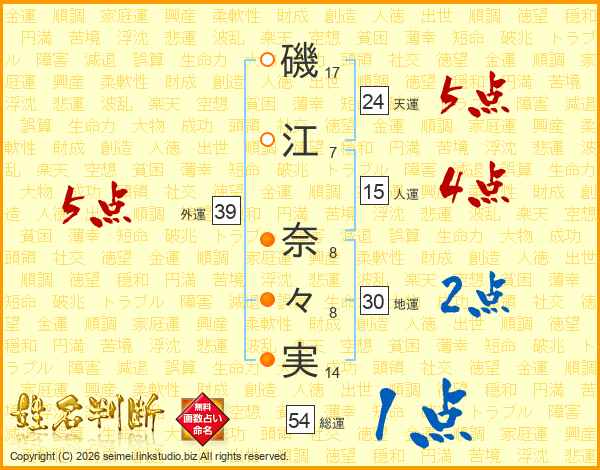 磯(17画)江(7画) 奈(8画)々(8画)実(14画)