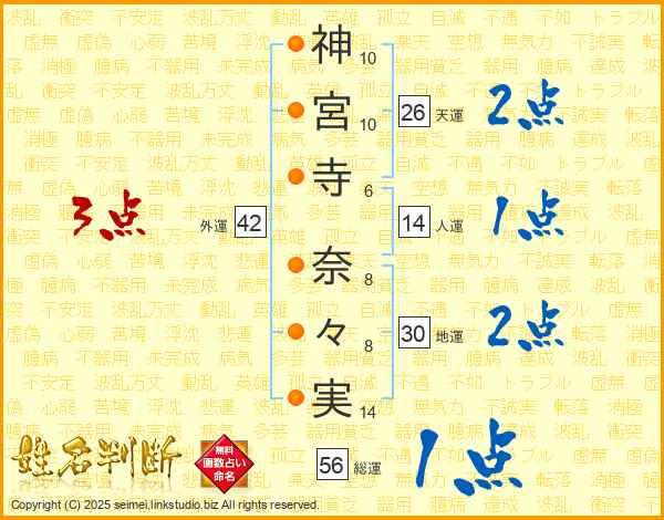 神(10画)宮(10画)寺(6画) 奈(8画)々(8画)実(14画)