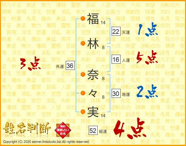 福(14画)林(8画) 奈(8画)々(8画)実(14画)