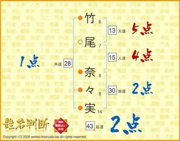 竹(6画)尾(7画) 奈(8画)々(8画)実(14画)