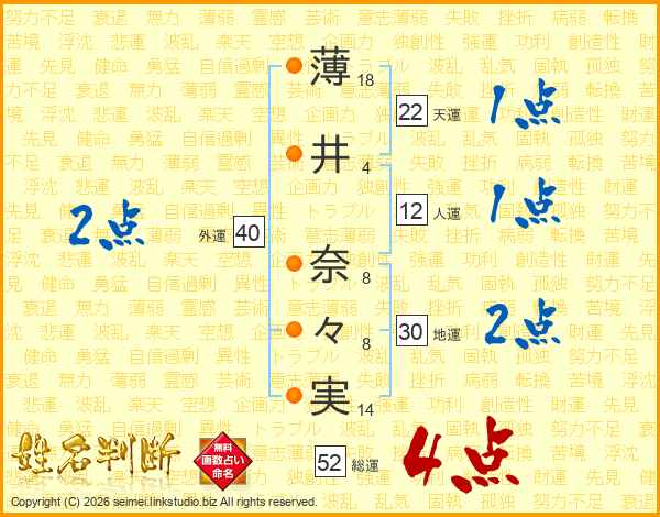 薄(18画)井(4画) 奈(8画)々(8画)実(14画)