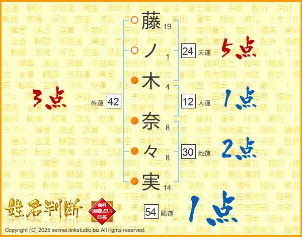 藤(19画)ノ(1画)木(4画) 奈(8画)々(8画)実(14画)