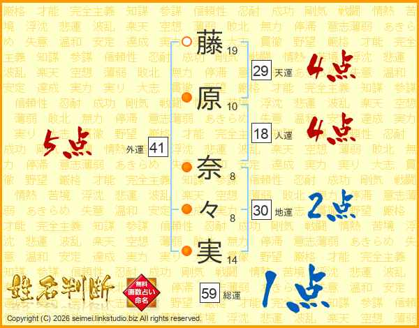 藤(19画)原(10画) 奈(8画)々(8画)実(14画)
