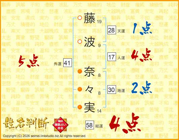藤(19画)波(9画) 奈(8画)々(8画)実(14画)