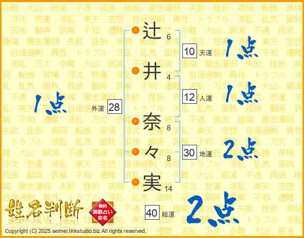 辻(6画)井(4画) 奈(8画)々(8画)実(14画)