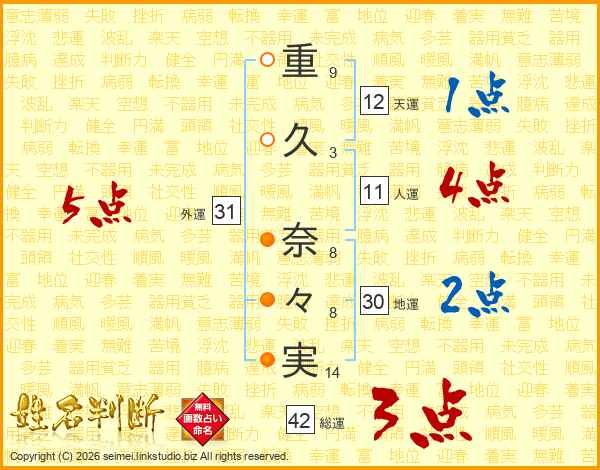 重(9画)久(3画) 奈(8画)々(8画)実(14画)