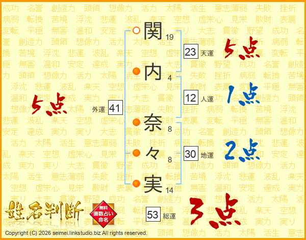 関(19画)内(4画) 奈(8画)々(8画)実(14画)