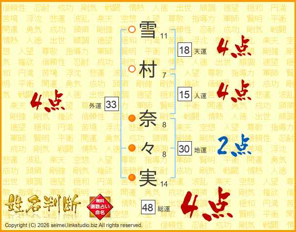 雪(11画)村(7画) 奈(8画)々(8画)実(14画)