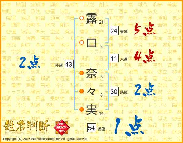 露(21画)口(3画) 奈(8画)々(8画)実(14画)