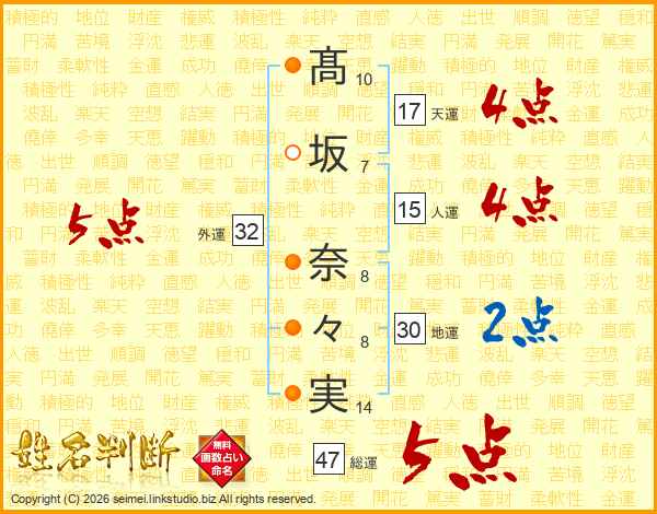 髙(10画)坂(7画) 奈(8画)々(8画)実(14画)